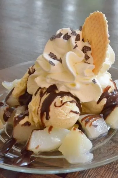 Vanilleeis, Birne, Schokosoße, Sahne, dunkle Schokostreusel